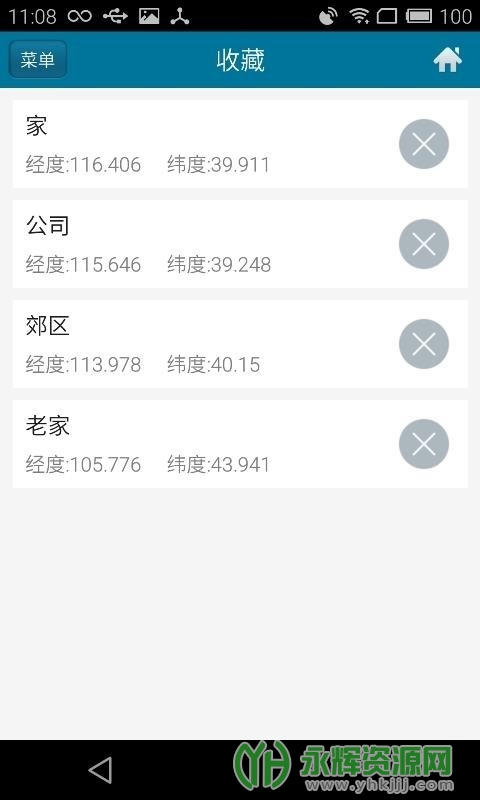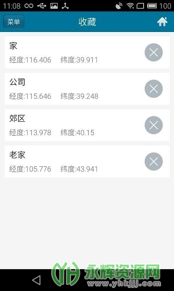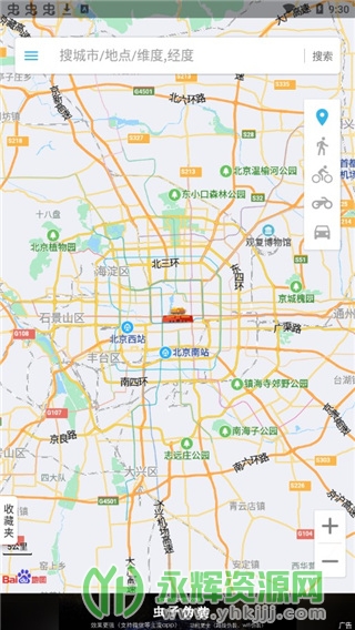 4、收藏功能:点击首页的收藏按钮,可以将地图的中心点位置收藏,自定义名称。在侧边菜单栏点击“收藏”进入收藏页面就可以看到收藏过的位置。点击收藏的伪装,地图会自动移至该地点。