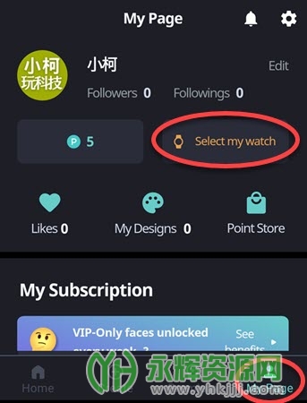 3、接下来,将应用程序与手机连接起来,你可以在手机的右下角点击“我的页面”,然后选择“选择我的手环”;