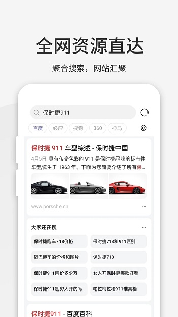 设计界面回归初衷,干净而简洁主页收藏功能;特色聚合搜索,目标站点一触即达,无惧网络失联。