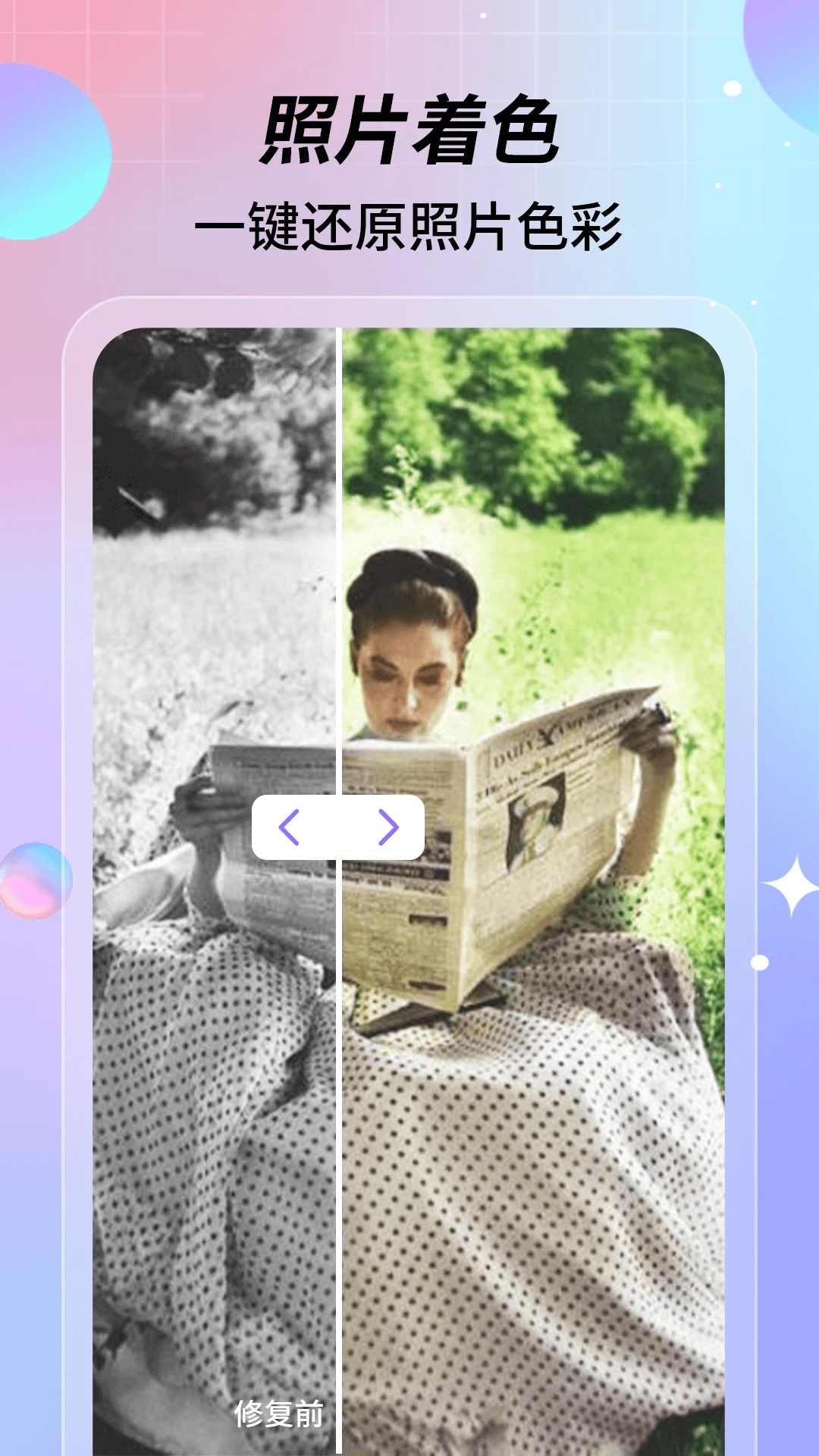 一键还原照片,给照片上色,在视频编辑中涵盖多种差异化风格。多种贴纸,字幕,任你选择。使图片编辑,图片制作,长图拼接,抠图,照片编辑,证件照制作,gif制作,海报制作,都不不再难,更加有趣。