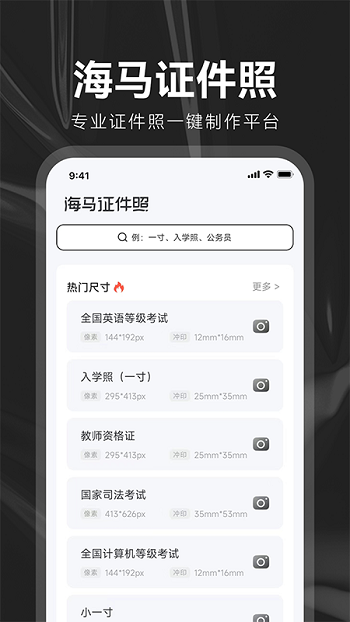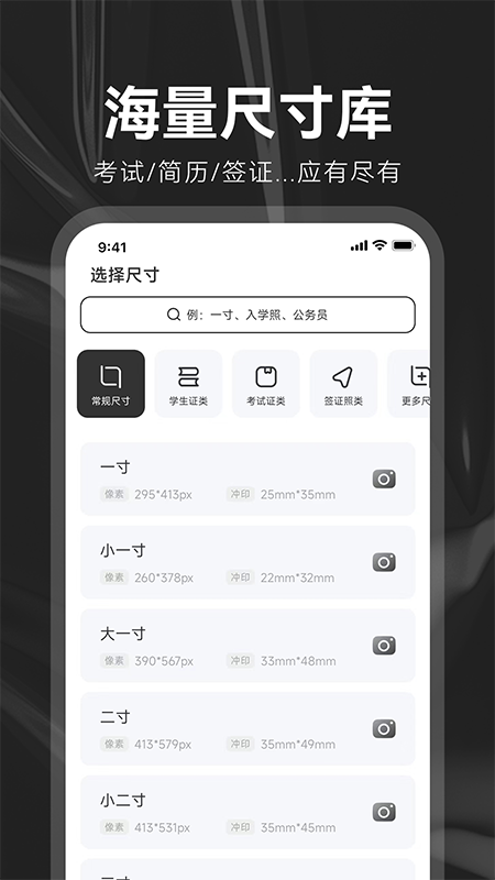 包含1寸、2寸、3寸、4寸等常规尺寸,并配有常用基础色和高端底色。同时提供官方指定证照规格超百种,比如毕业证、学位照、入学照等学生证,会计、考研、计算机、公务员、医护、考研、幼师及语言类考试证,社保、签证、普通话、简历、驾照等,满足您的各类拍摄场景需求。AI大数据分析下,软件还能智能推出当下热门的证件照尺寸供你选择,更快捷高效的用手机制作证件照。