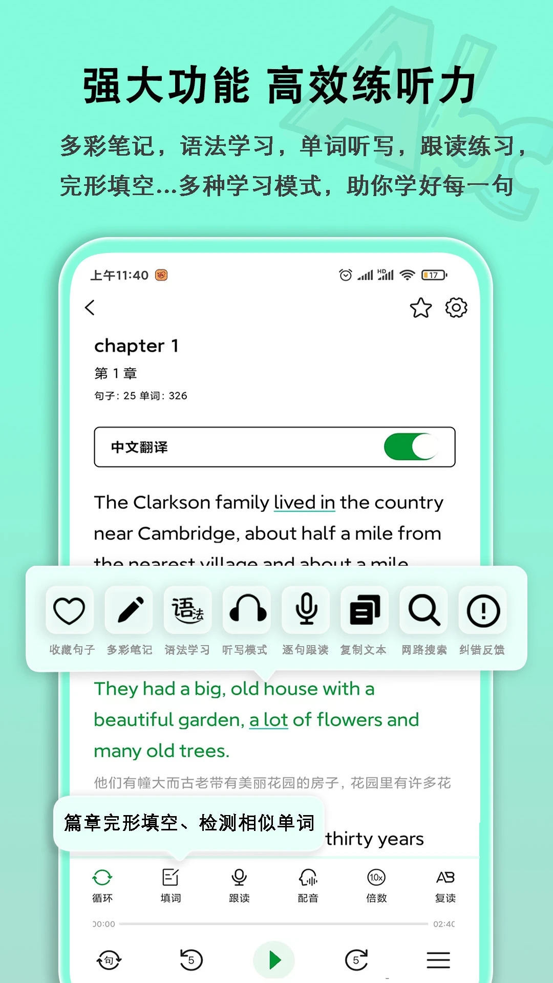 可查看句子的音标和连读,方便练习口语和听力。还可以进行口语评测和选择全篇的听力填词,用于精听名词、动词、形容词和副词。