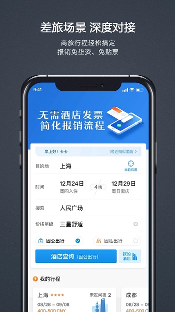 app主要是用于解决一站式商旅及费用管理云解决方案,提供“一站式企业商旅及费用管理软件”服务,业务定位于打通企业差旅及其他消费场景中的“消费-报销-费控-财务”全流程,包含了从企业费用预算,企业费用管控,员工费用报销,发票合规审核,财务系统集成,企业员工商务活动相关的出行、住宿、商务宴请等服务。