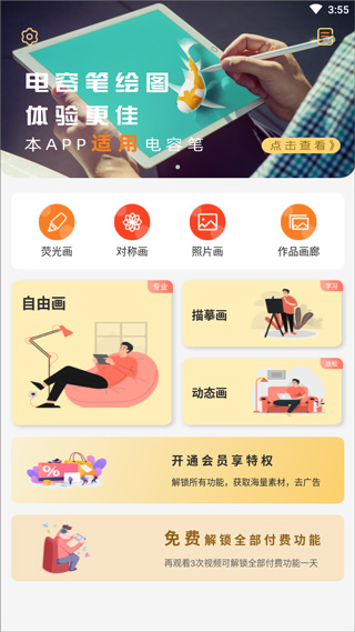 2、软件拥有自由、临摹、动态三种绘画方式,这里以自由画为例。