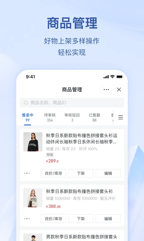 【商品管理】支持上下架商品、调整价格库存、修改详情等商品管理操作