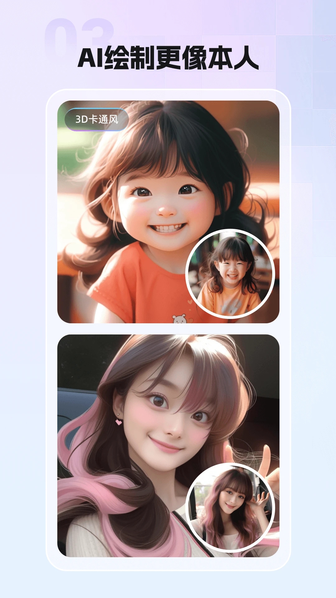 好奇漫画世界里的你是什么样子的?一键秒变3D漫画效果!小漫头像根据你上传的原照片制作,真实逼真,AI一键秒变Q版卡通动漫头像,更像本人,各种女生头像、男生头像、闺蜜头像、情侣头像、宝宝头像快速生成,让你看到漫画的自己,超流行风格,生动个性又浪漫。