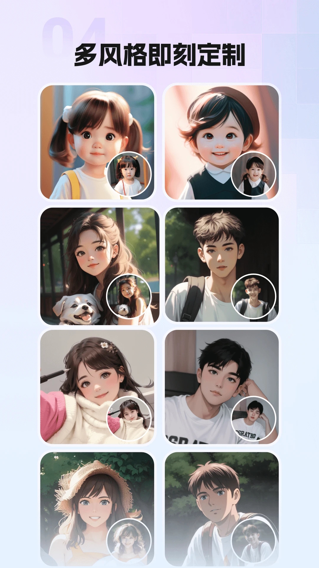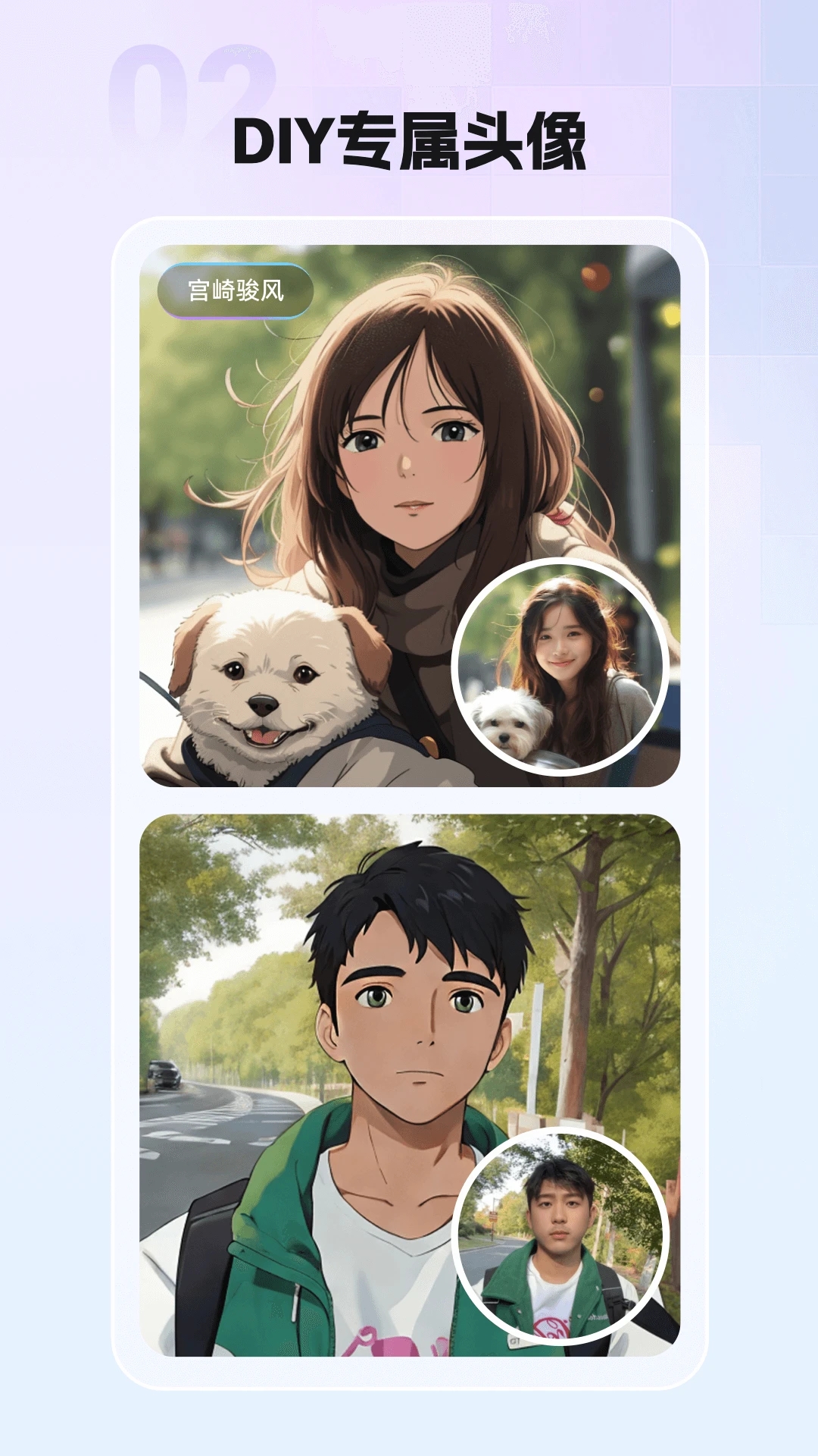 二次元、复古、国风、小清新、卡通人物形象;写实、水彩、线条、动画等多种风格任您挑选,百变卡通脸让你秀出更多元的自己!