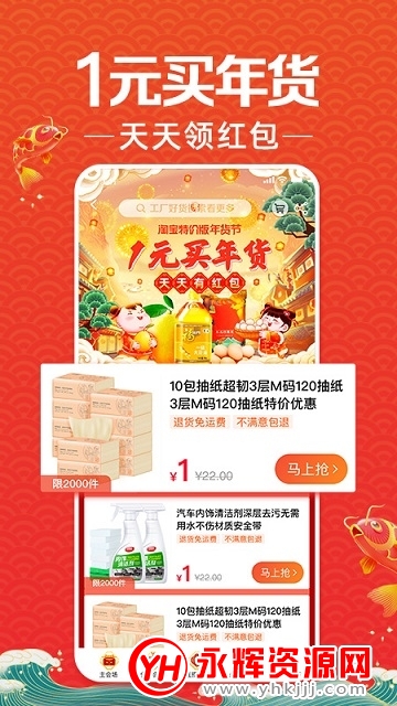 手机淘宝2021年货节满减活动版是淘宝在春节即将到来之际推出的全新版本,在这里用户可以享受到各种优质的商品,而且由于临近新年,所有的商品都正在做活动打特价, 用户在购物的时候非常的实惠,既方便又好用,有需要的朋友就快来永辉下载体验吧!