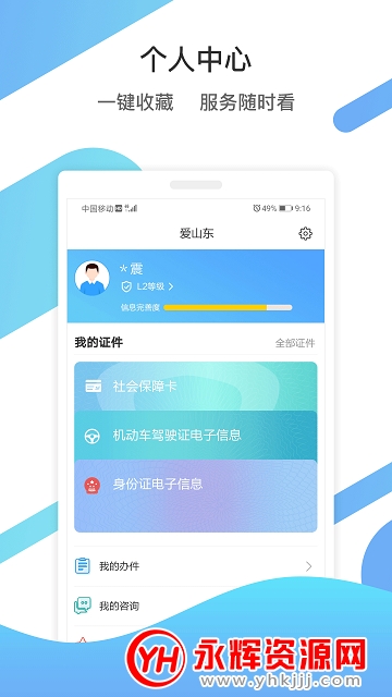 对接省统一身份认证平台,提供与个人事项相关的“我的”办件等“贴身行”服务。以往办理业务需要携带许多证件材料,30余项电子证照将在11月底全部亮证,这些电子证件均可通过“爱山东”APP领取。目前已经提供了包括电子驾驶证、电子身份证、电子出生医学证明、医护人员执业证书等在内的电子证照。这些电子证照将极大解决出门忘带证件等难题。