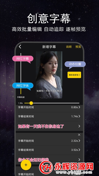 视频配字幕app是一款非常好用的视频编辑应用软件。使用这款软件,你可以将你手机中的视频添加字幕等功能,十分方便。对这款软件感兴趣的朋友们可以来永辉资源网下载体验一番哦!