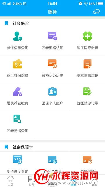 社会保险,可以进行参保信息查询、居民医保缴费、养老待遇查询等;