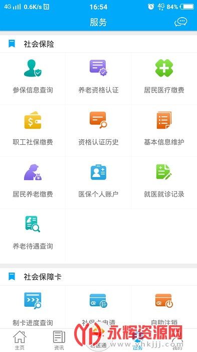 社会保险,可以进行参保信息查询、居民医保缴费、养老待遇查询等;