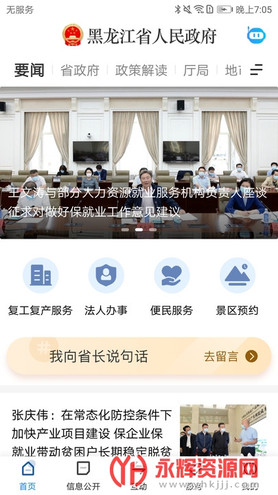 黑龙江省政府app是一款实用的生活服务软件,软件集新闻资讯、政务服务和公共服务于一体。用户既可以在这里查看本市的最新热门新闻资讯,也可以在线办理各种快捷业务,足不出门就能够了解最新资讯,并享受到快捷的生活服务,非常的方便。感兴趣的朋友门快来下载吧!