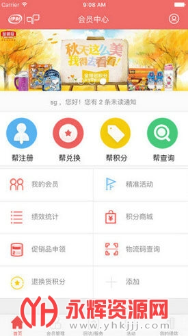 1、其中首页包括:帮会员注册、帮会员积分、帮会员兑换、帮会员查询、买赠兑换、物流码验证等功能,营养顾问可以快速完成日常所需功能。