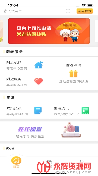 一款专为武汉地区的老人打造出的养老服务app。平台上能够申请办理养老补助,还能查看到武汉本地的养老管理中心,也有养老服务项目,你能在这儿查看你的主题活动信息和预定服务。随时随地赶到服务平台查看养老、政府部门的新闻报道,也有各种各样日常生活新闻资讯等着你查看。