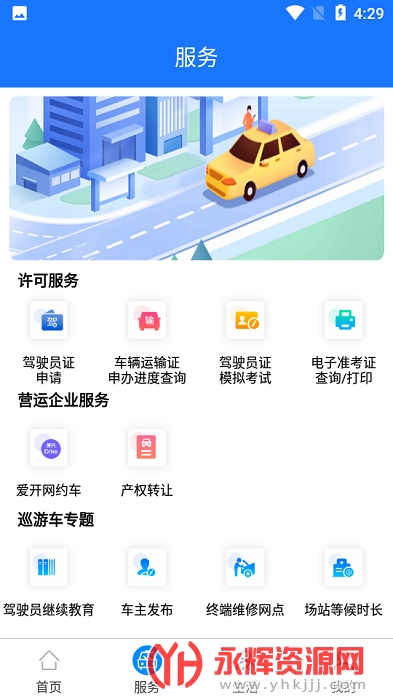 为想取得《出租车从业资格证》的考生提供网上报名、预约、模拟考试、准考证自助打印等服务。
