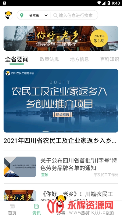 四川农民工服务平台app是为四川本地农民工朋友们提供的便民生活服务软件,使用这款软件你可以了解全国各项资讯,还可以办理许多生活服务功能,有需要的朋友们快来永辉资源网下载吧!