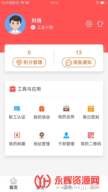 我的模块具有功能:入会转会、职工认证、账号绑定、积分商城、我的发帖、我的活动、我的业务、我的收藏、地址管理、建议反馈、我的二维码、重置密码、我的帮扶等功能。