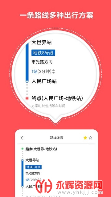 输入任意公交或地铁的起点站与终点站,查询地点之间的地铁路线、公交换乘方案、地铁站地图导航路线等信息,并提供多种路线方案可切换选择。