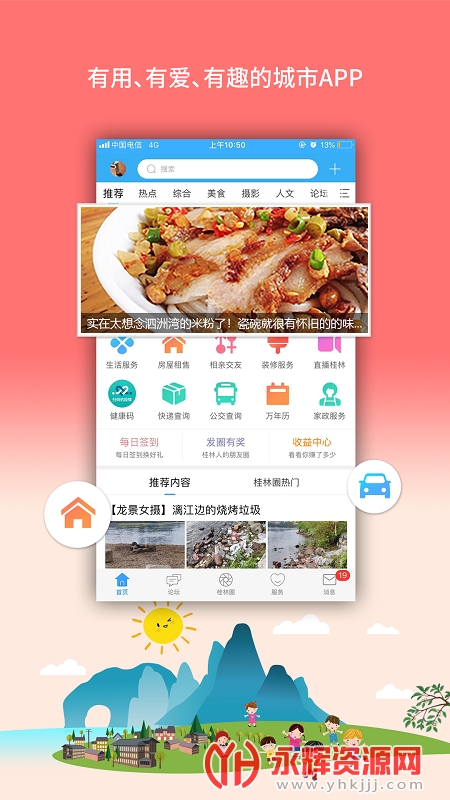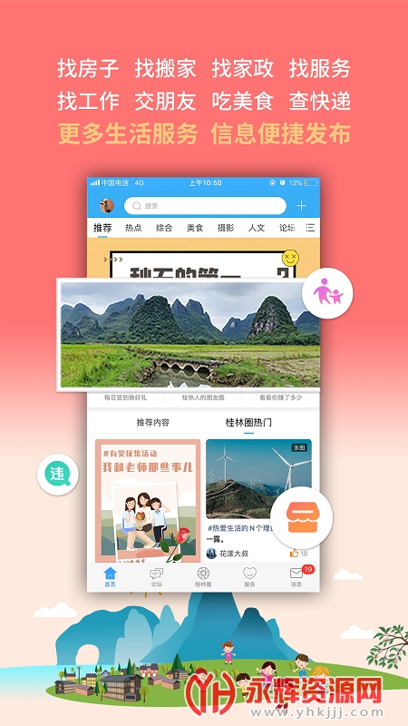 桂林生活网app是为桂林当地朋友们提供的生活服务软件,软件的功能十分全面,能给你提供房屋租售、相亲交友、装修服务、公交查询、健康码等一系列功能,有需要的朋友们可以来永辉资源网下载哦!