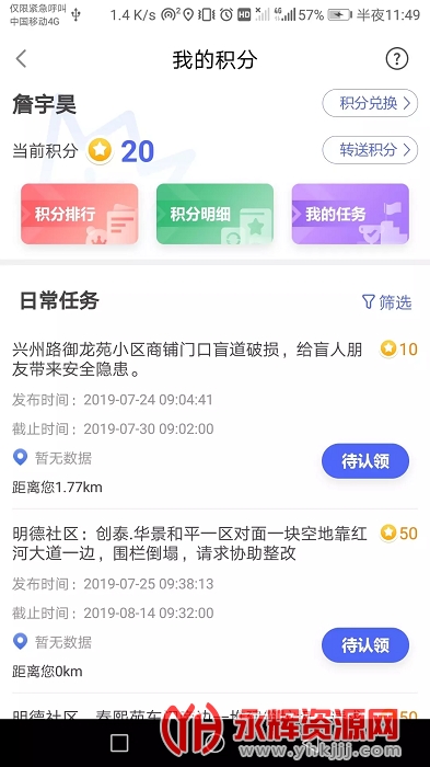 通过APP内“随手拍”,上传城市环境、治理、交通等方面的问题信息、建议意见,通过审核后,即可获得积分。