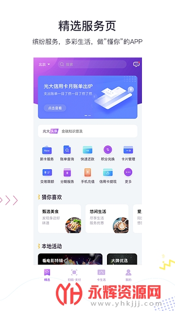 “首页精选” 呈现精彩的营销活动展示、提供精选功能的快捷入口、光大10元惠品牌活动、幸运大抽奖等。让您及时方便了解光大信用卡最新信息。