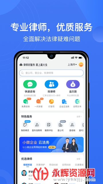 赢火虫云法务是一款非常好用的掌上法律援助服务手机软件,在这里为用户带来了精通各种板块法律的律师提供给用户专业可靠的法律援助服务,让用户轻松请到专业的律师来解决各种问题,特别的方便,有需要的朋友就快来永辉下载体验吧!