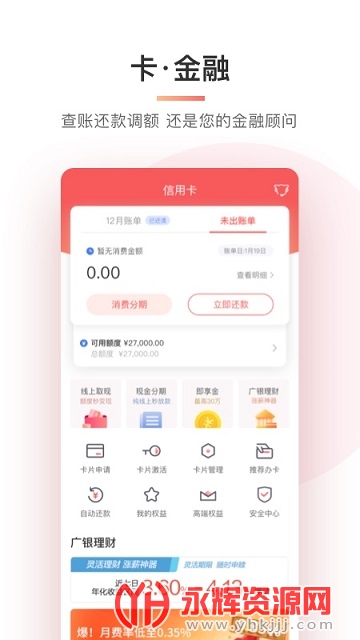 广州银行信用卡app是一款专门为广州银行的信用卡用户打造的掌上业务办理手机软件,软件通过了强大的互联网大数据技术为用户提供了便捷高效的线上办事平台,帮助用户快速处理各种信用卡问题,有需要的朋友就快来永辉下载体验吧!