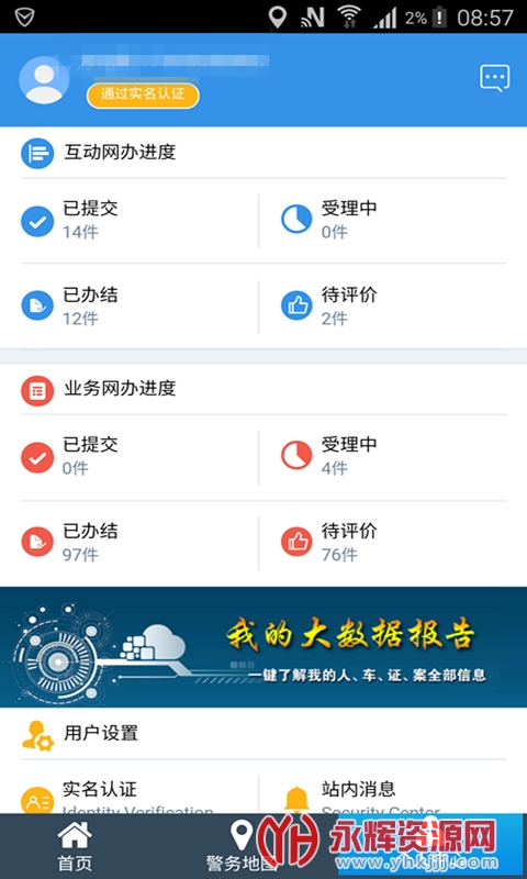 百姓可以在平台查看最新的警务动态、通知通告、警方报道,查询车辆违章、驾驶员记分、身份证办理进度、出入境证件办理进度、走失人口、案件进度、司法鉴定、失物招领挂失查询,同时在实名认证后可以生成个人相关的公安大数据报告。