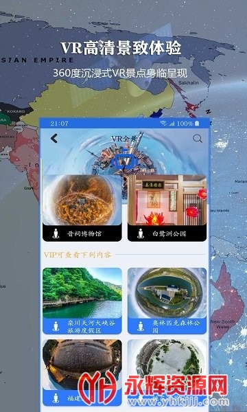 VR功能支持360°全景式游览,带你一步一步领略世界人文奇观和自然美景。观赏时部分景点还配置了导游语音播报,看风景,涨知识。