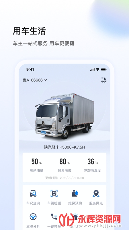 陕轻智慧行app是为广大陕汽轻卡汽车的车主朋友们提供的应用软件,使用软件可以连接你的汽车实时查看汽车剩余油量、冷却液温度、尿素液位还有着车况查询等等一系列功能,非常方便。有需要的朋友们欢迎来永辉资源网下载使用哦!