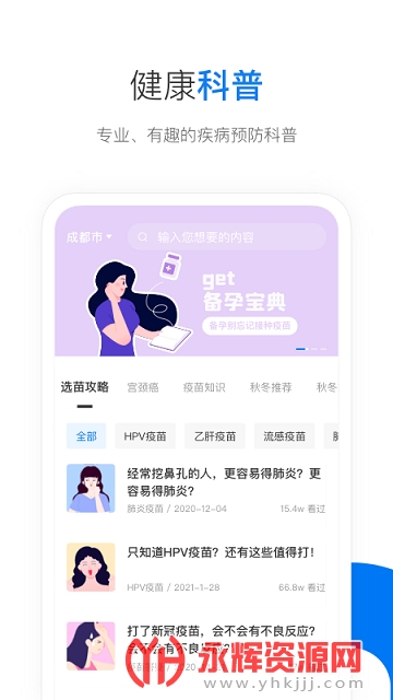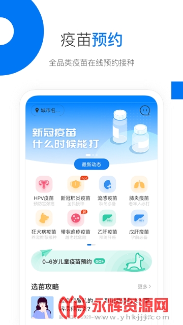 疫苗预约:支持HPV疫苗、新冠疫苗、流感疫苗、乙肝疫苗等成人及儿童全品类疫苗在线预约。