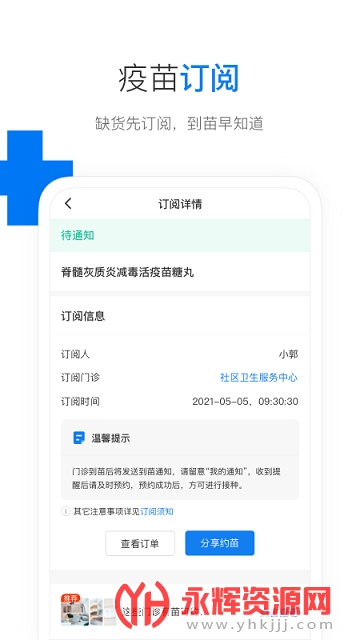 疫苗订阅:稀缺疫苗约不到?先来订阅到苗通知,门诊到苗后通知预约。