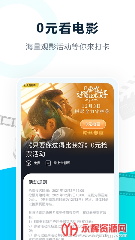 e票电影免费送票app是十分受欢迎的电影购票软件,在这里你可以查看到最新电影资讯内容,还可以通过软件在线购买电影票。喜欢看电影的朋友们别错过了哟,快来永辉资源网下载吧!