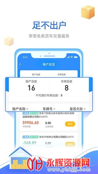 货车人专属的APP,过高速85折,先通行后付费,交通卡充值、随心结还款、一键查账,简单快捷,支持徽通卡、苏通卡、八桂行卡、浙通卡办理。