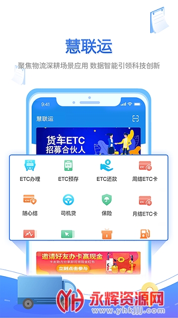 慧联运APP-货车人专属的APP,过高速85折,先通行后付费,交通卡充值、白条还款、商城购物一键操作,简单快捷。