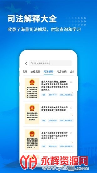 3.法律法规详细分类,一键查找。包含最高法颁布的全部法律法规大全及司法解释,能够方便地查阅相关的法律法规数据库中司法解释及案例。