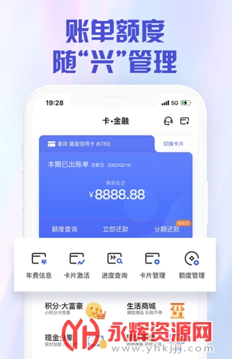 1、【账单额度 随“兴”管理】 额度实时更新全掌握,固额、临额调整一键申请;轻松管理信用卡账单,顺着查、反着查、挑着查、自定义排序查,还能0手续费跨行还款,竭诚满足您的卡账需求。