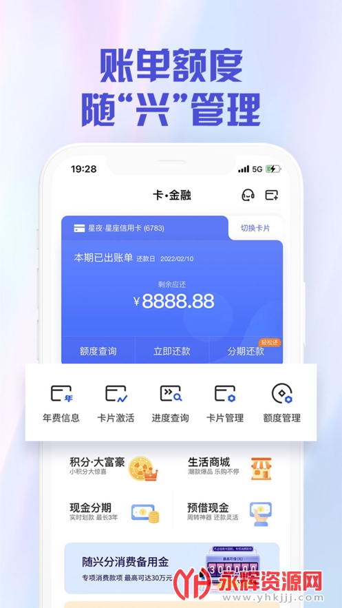 1、【账单额度 随“兴”管理】 额度实时更新全掌握,固额、临额调整一键申请;轻松管理信用卡账单,顺着查、反着查、挑着查、自定义排序查,还能0手续费跨行还款,竭诚满足您的卡账需求。