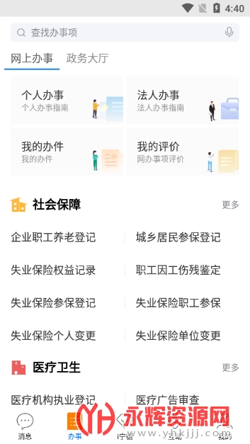 4、在“办事”的服务功能里,你可以根据自身的需求进行选择,是个人办事、法人办事,还是了解社会保障、医疗卫生情况,都可以在这里进行办理相关业务。