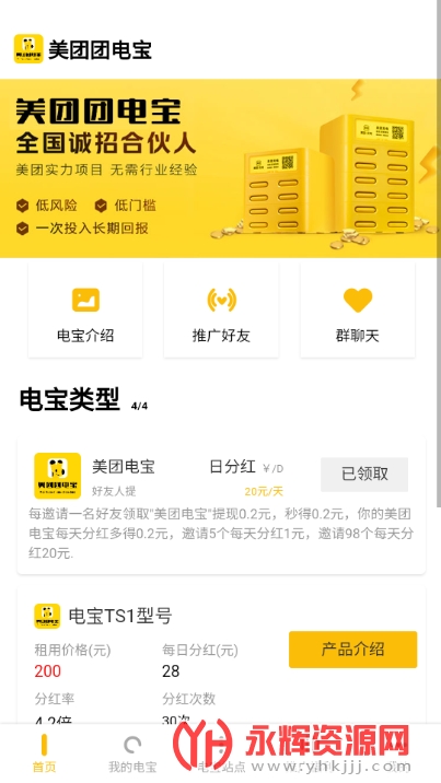 这里为用户朋友们带来了美团电宝项目官方最新版软件,这是一款以充电宝为主题的新型分红奖励平台,用户可以通过特别的方式来获取到每天的奖励分成,领取到更多的分红,美团充电宝项目总体来说还是很给力的,有需要的朋友现在就来下载吧!
