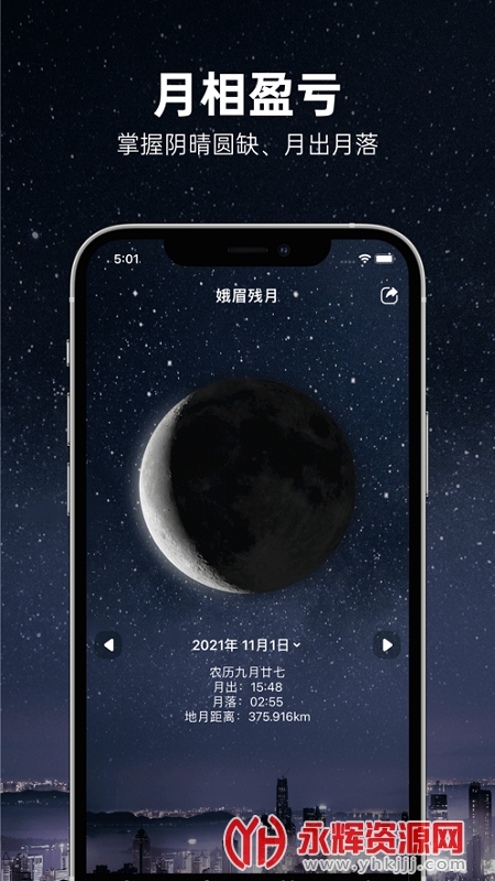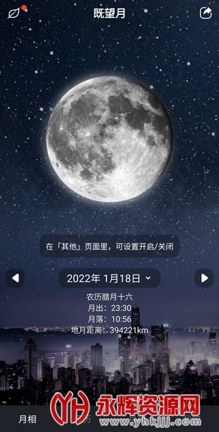 【Moon】想知道每一天月亮的姿态吗,切换日期即可拥有!从月升月落时间到地月距离、从方位角到农历日期...还有你所不知道的诗意月相名,月亮美图更可一键保存!