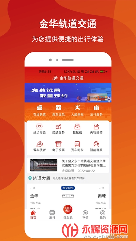 金轨智行”APP是一款便民出行的应用,具备金华轨道交通查询、购票、乘坐等服务。“金轨智行”APP提供刷码进出站、线路查询、列车时刻表、站点周边、失物招领、预约乘车、爱心使者活动等功能,为乘客提供更先进、更方便、更全面的服务。