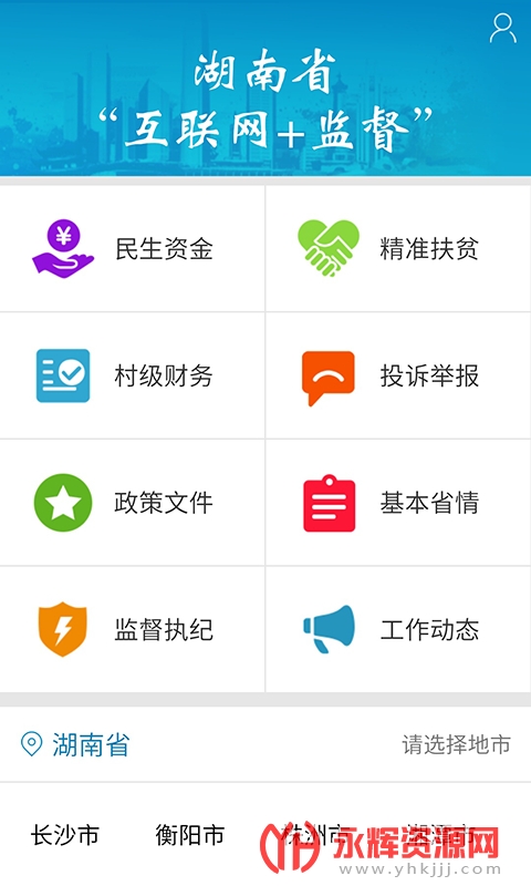 3、三湘e监督设置民生项目、精准扶贫、村级财务、投诉举报等模块