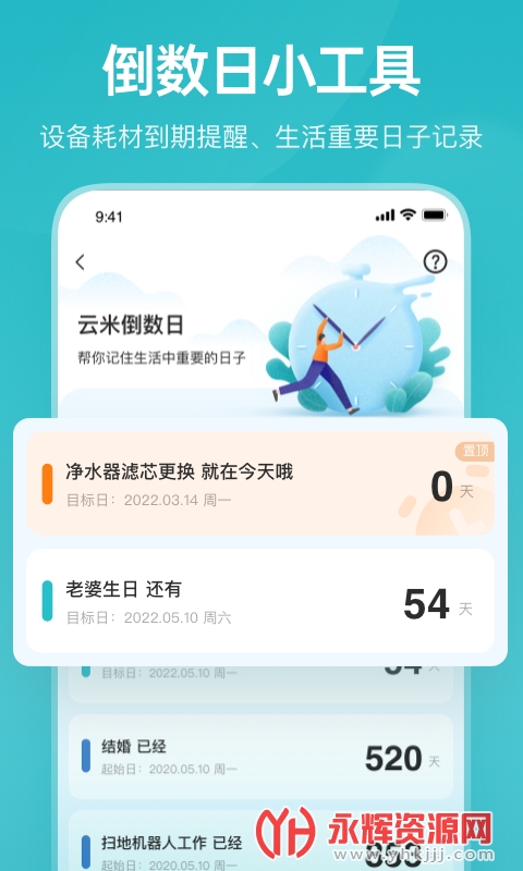[云米倒数日]设备耗材到期、生活中重要日子提醒,纪念日记录,还支持一键同步到大屏冰箱展示,重要日子全家一起关注哟。