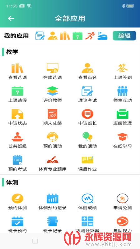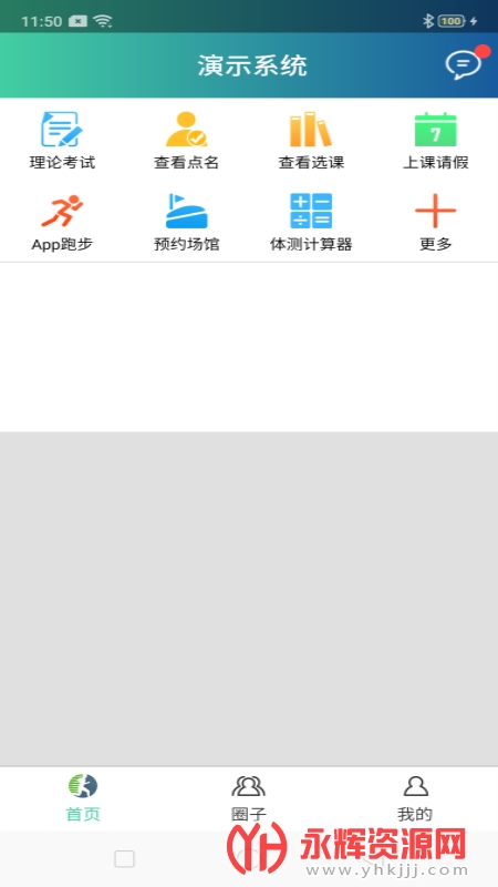 1、首页师生互动、查看点名、查看选课、上课请假、app跑步、预约场馆、借还奇才等常用应用以及热门推荐。