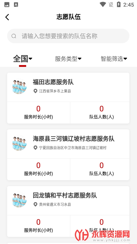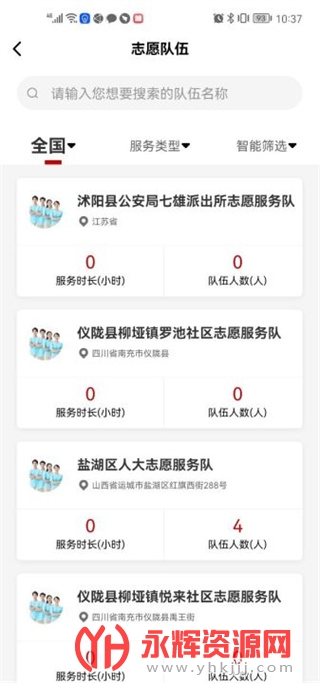 4、在旁边的志愿队伍时,用户也可以选择自己想要参加的志愿服务队,这里也要看看地区哦!