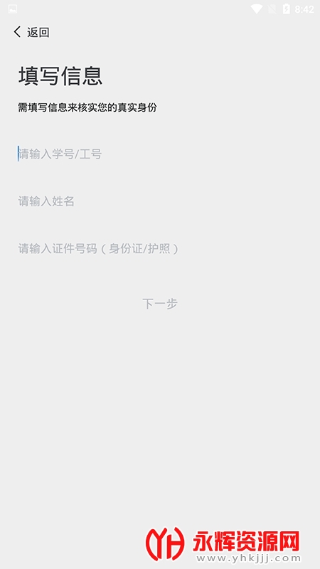 第二步:填写个人信息(学工号、姓名、身份证号)进行账号激活,点击 “下一步”;
