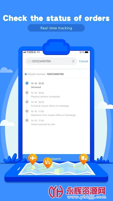 快递查件:快递信息实时更新推送,可以通过手机号码和账号绑定、输入运单号或扫一扫的方式,查看半年内运单的快递物流信息;