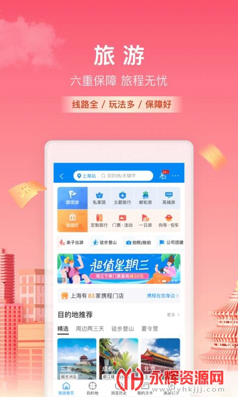- 自由行:首创“微领队”同行群,相同目的地、出发时间驴友群中互助交友,还有携程领队提供各种行中服务。自由行加微领队,省心又有趣!